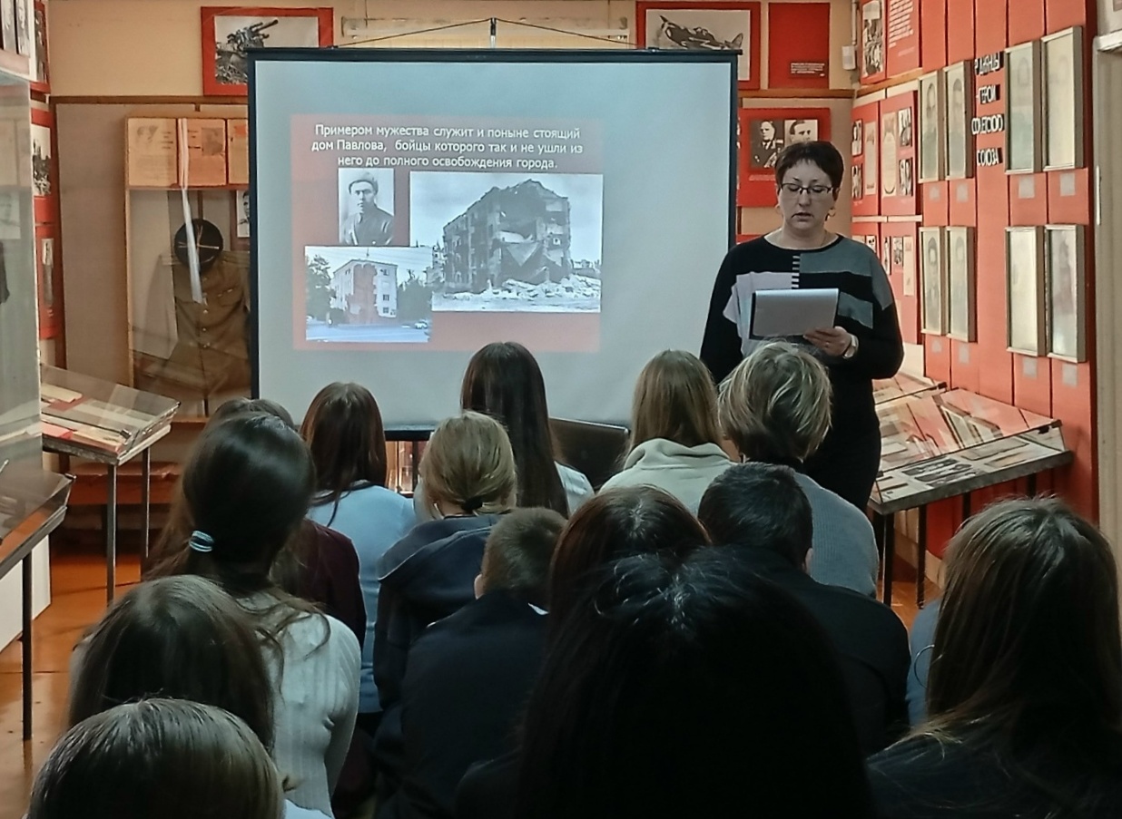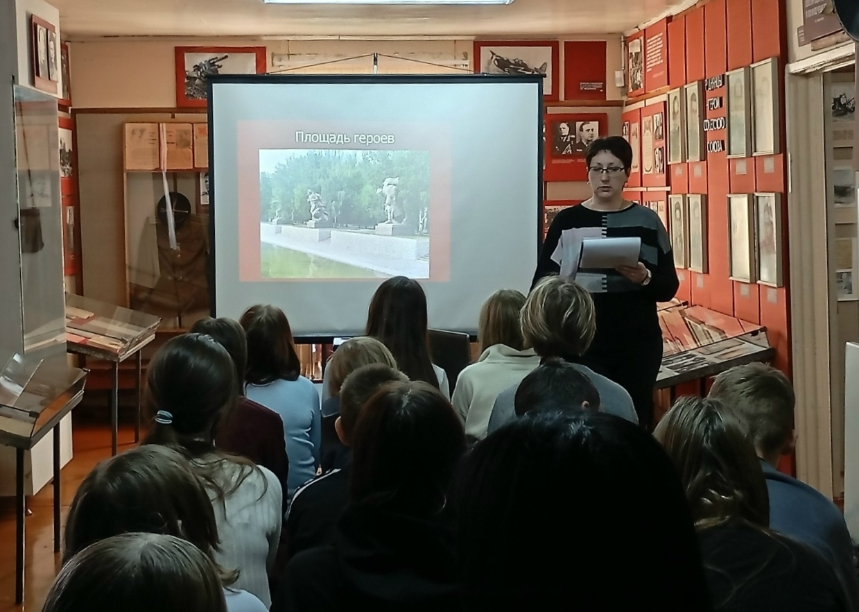Ребята услышали рассказ о Сталинградской битве - самом тяжёлом и кровопролитном сражении Великой Отечественной войны. Грандиозная по масштабам битва, длившаяся ровно 200 дней и ночей, стала переломным моментом и положила начало контрнаступлению советских войск. Защитники Сталинграда ценой своей жизни остановили врага и не пустили его на левобережье. "За Волгой для нас земли нет!" - с таким девизом бойцы держали оборону главной высоты – Мамаева кургана. Сражались за каждый дом, за каждый этаж, за каждую пядь земли. За шесть с половиной месяцев кровопролитных боев наши войска пережили разгром и отступление, тяжелейшую оборону разрушенного города, превращённого в сплошное море руин, и победоносное наступление, которое закончилось поражением немецкой группировки.