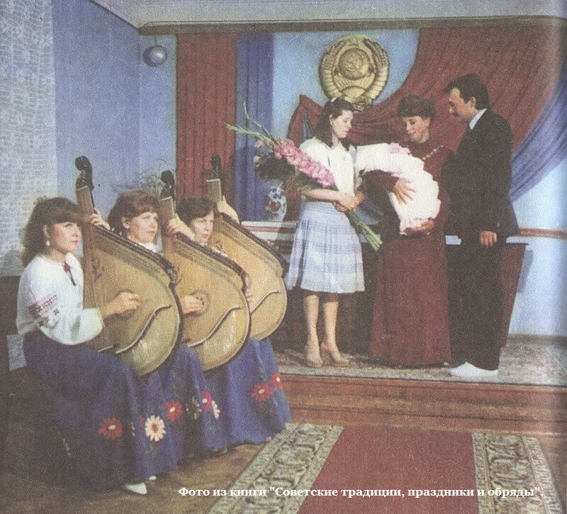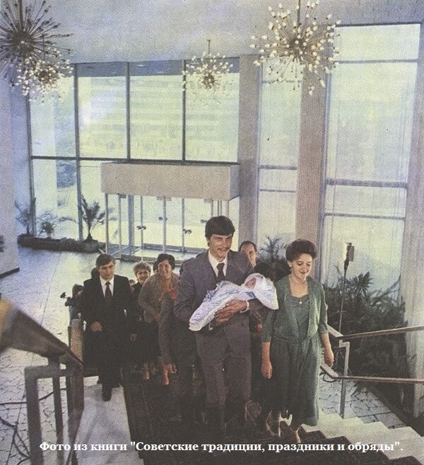 Торжественная регистрация новорожденных. Наверное, не каждый поймет, о чем идет речь. В Советском Союзе практиковалась наряду с обычной торжественная регистрация младенцев. Можно было не просто прийти в ЗАГС со справкой из роддома и зарегистрировать своего ребенка, а обставить все это торжественно. Например, в Ленинграде в 1965 году был открыт Дворец "Малютка" именно для этих целей.