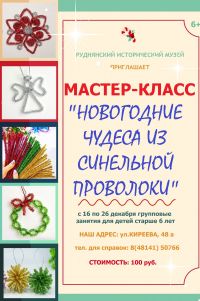 Руднянский исторический музей в рамках программы "Музейная мастерская" приглашает всех желающих на новогодний мастер-класс "ЧУДЕСА ИЗ СИНЕЛЬНОЙ ПРОВОЛОКИ".
