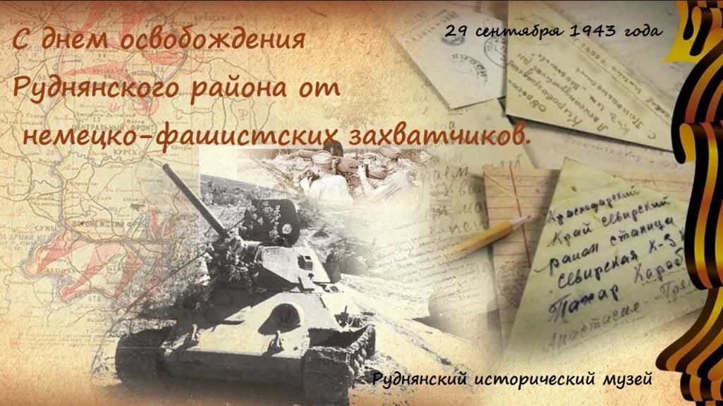 День 29 сентября 1943 года навсегда вписан в историю Рудни как память о великом событии - освобождении города и района от самого страшного нашествия немецко-фашистских захватчиков. Это праздник нашей малой родины, который особенно дорог нам, руднянам, тем, кто живет и трудится в Руднянском округе. Это священная дата, символ мужества и героизма, гордости и славы.
